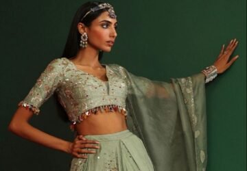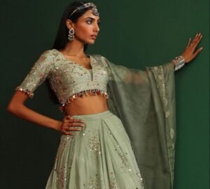 Stepping away from the conventional reds and maroons, Celestial Sage is the dream bridal lehenga for the bride who craves