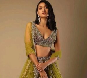 Stepping away from the conventional reds and maroons, Celestial Sage is the dream bridal lehenga for the bride who craves a fresh, elegant, and serene aesthetic. Draped in a unique muted sage green, this lehenga channels a celestial, goddess-like aura — making it an unforgettable ensemble for a wedding day, engagement, or even a glamorous sangeet.