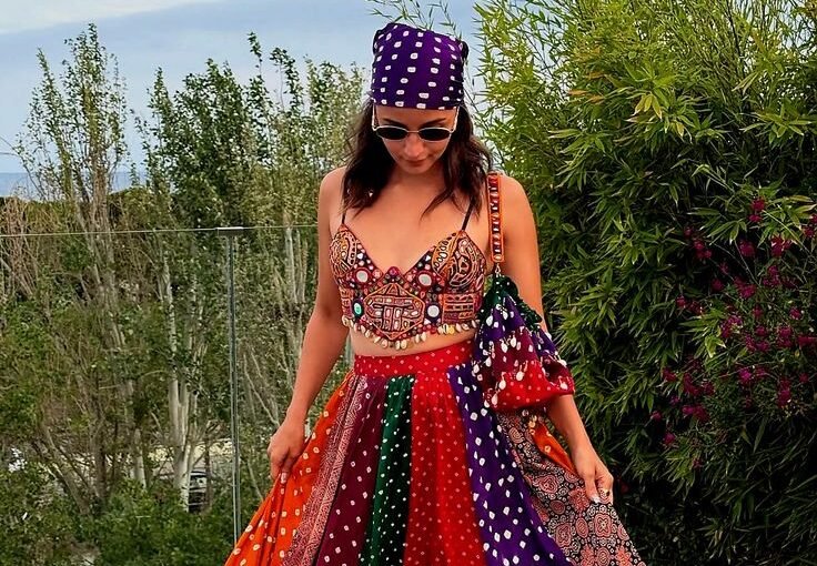 What takes this look to the next level is the styling—paired with a matching Bandhani headscarf and a coordinated potli bag, the accessories are as much a part of the outfit’s charm as the garments themselves. Round sunglasses lend a cool-girl vibe, and the overall ensemble feels like a stylish nod to the ’70s hippie spirit—married perfectly with Rajasthani flair.