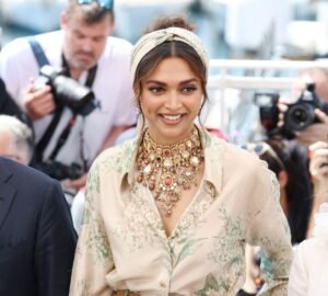 Styled with metallic pointed-toe heels and minimal accessories, the outfit lets the embroidery speak volumes. Soft waves cascading over one shoulder add a hint of vintage glam, while a simple gold chain balances the ornate elements with a touch of modern polish.