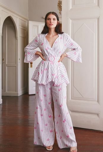 At the core of this outfit is a coordinated two-piece set featuring a deep V-neck peplum top and wide-leg palazzo trousers. The fabric is adorned with vertical stripes in soft grey, which elongate the frame, while delicate pink floral motifs add a fresh, youthful charm to the overall aesthetic. The juxtaposition of structured stripes with scattered blossoms creates visual harmony — polished yet playful.