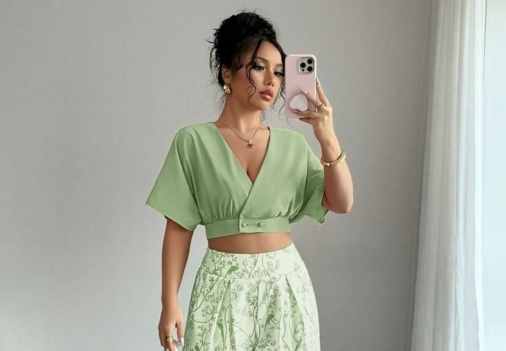 The set features a deep mint green cropped blouse, cut in a wrap-style V-neckline that flatters the décolletage and offers a breezy, open feel. The blouse cinches gently at the waist with subtle button detailing, creating a clean and defined silhouette without sacrificing ease. The kimono-style sleeves drape beautifully, adding a touch of relaxed glam while allowing for fluid movement — perfect for everything from brunch dates to stylish lounging.