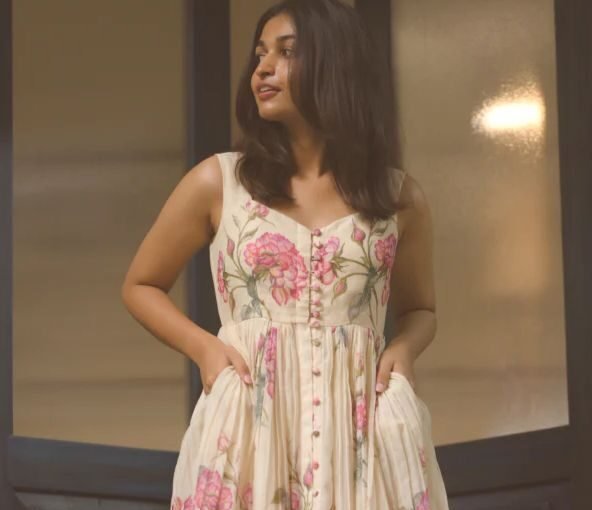 Crafted from soft, breathable cotton or mulmul fabric, the dress features a flattering A-line silhouette that cinches gently at the waist before flaring out into a gathered skirt, offering comfort without compromising on style. The off-white base serves as the perfect canvas for a cascade of delicate pink floral prints, adding a dash of romance to the ensemble. The front button-down detailing enhances its vintage charm, while the deep neckline adds a touch of modern chic.
