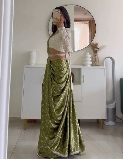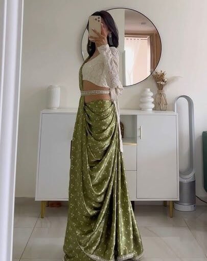 The featured saree is a lustrous olive green satin with delicate prints and a subtly embellished hemline, exuding understated glamour. What elevates this look is the choice of blouse — a stylish ivory lace full-sleeved crop top that brings texture, sophistication, and an unexpected Western twist to the outfit. Paired with a statement belt at the waist, the ensemble is cinched to perfection, enhancing the hourglass effect of the reverse draping.