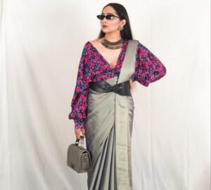 This draping enhances the natural silhouette, especially with a blouse that’s equally minimal yet chic. Here, the deep sweetheart neckline blouse adds a soft femininity, while the statement choker and bold ring offer a classic nod to vintage styling without overpowering the look.