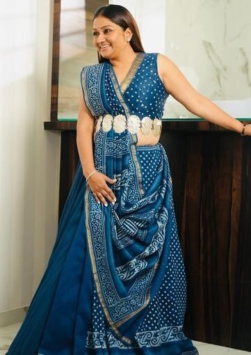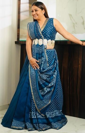 This look is centered around a rich indigo blue saree adorned with intricate Bandhani-inspired patterns and elegant border detailing. What sets this drape apart is the sleeveless V-neck blouse, mirroring the lines of the pallu for a clean, geometric finish that flatters the upper body beautifully.