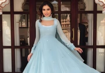 Graceful. Ethereal. Timeless. Celestial Serenity is a vision in soft ice blue — a handcrafted Anarkali gown that redefines understated
