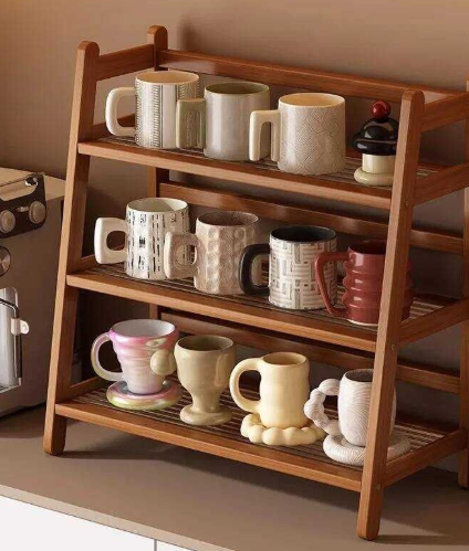 Rustic natural wood ladder-style mug stand featuring three open slatted shelves with raised edges, perfect for neatly displaying and storing a collection of assorted ceramic mugs, coffee cups, and travel tumblers. Compact countertop design with sturdy construction, allowing easy access while adding warm, organized charm to kitchen counters, coffee stations, or breakfast nooks. Ideal for mug enthusiasts who want to showcase their favorite pieces stylishly.
