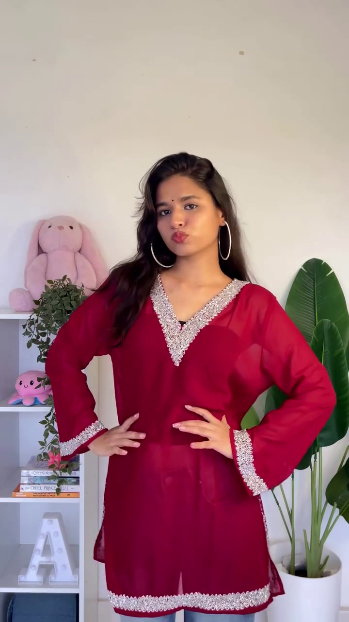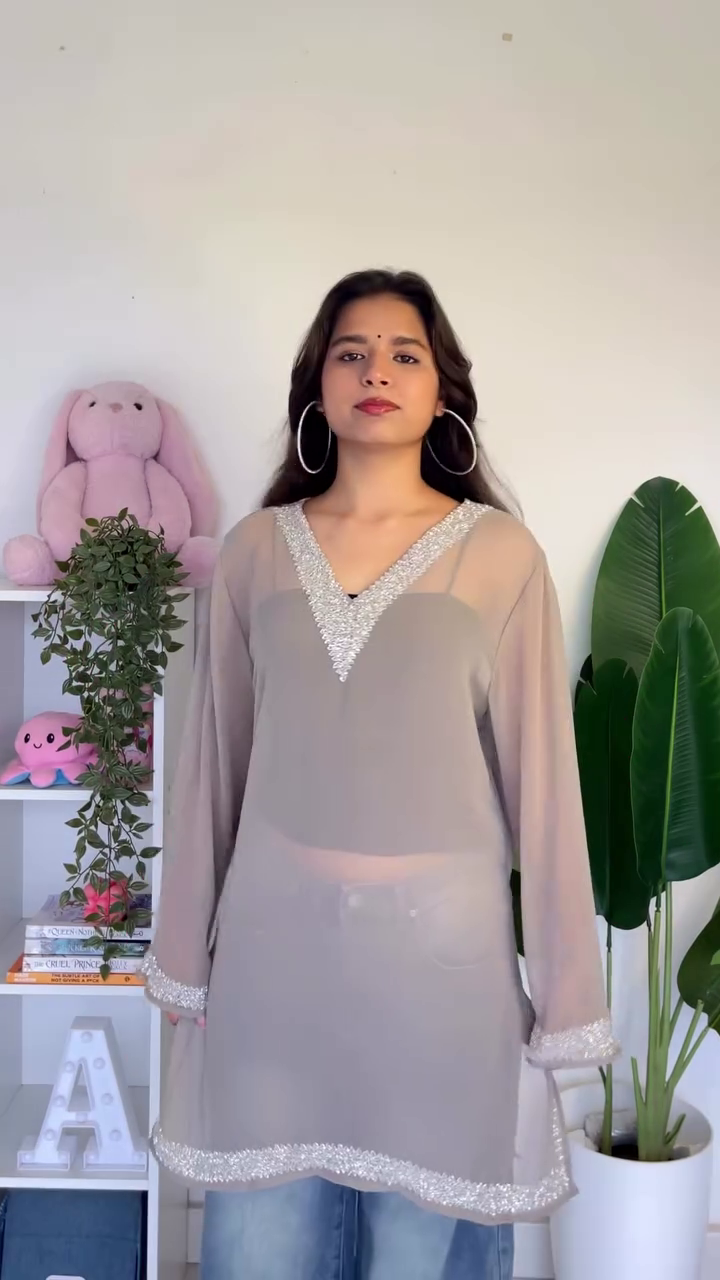 Style a black embellished V-neck kurti top with blue jeans for a modern Indo-western outfit. Perfect for casual outings, festive meetups, and day-to-night looks. Lightweight, elegant, and easy to accessorize with hoops and flats for effortless everyday fashion.