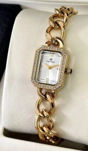A chic jewelry-style wristwatch featuring a rectangular white dial framed by a crystal-studded bezel and attached to a bold gold-tone chain bracelet strap. The elegant case shape and polished links give it a luxurious, fashion-forward look. Perfect for dressy occasions or accessorizing evening outfits, this piece doubles as both a watch and a statement bracelet.