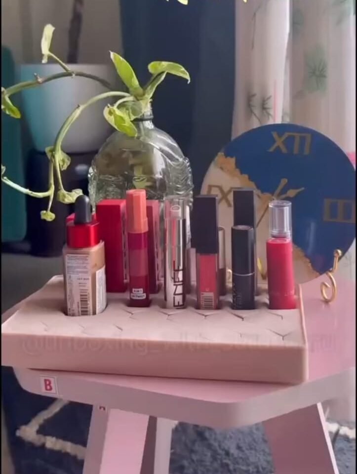Cosmetic Lipsticks Display on Pink Stool
