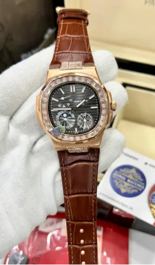 A premium wristwatch featuring a brown leather strap and a black chronograph dial with multiple sub-dials. The watch case has a polished metallic finish, giving it a sophisticated and high-end look. It is displayed on a gloved hand with a branded card in the background, suggesting authenticity and a luxury presentation suitable for collectors or gifting.