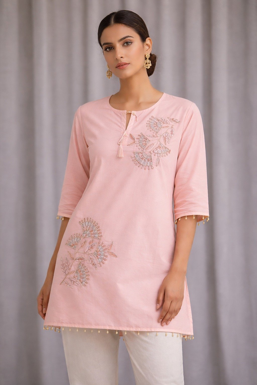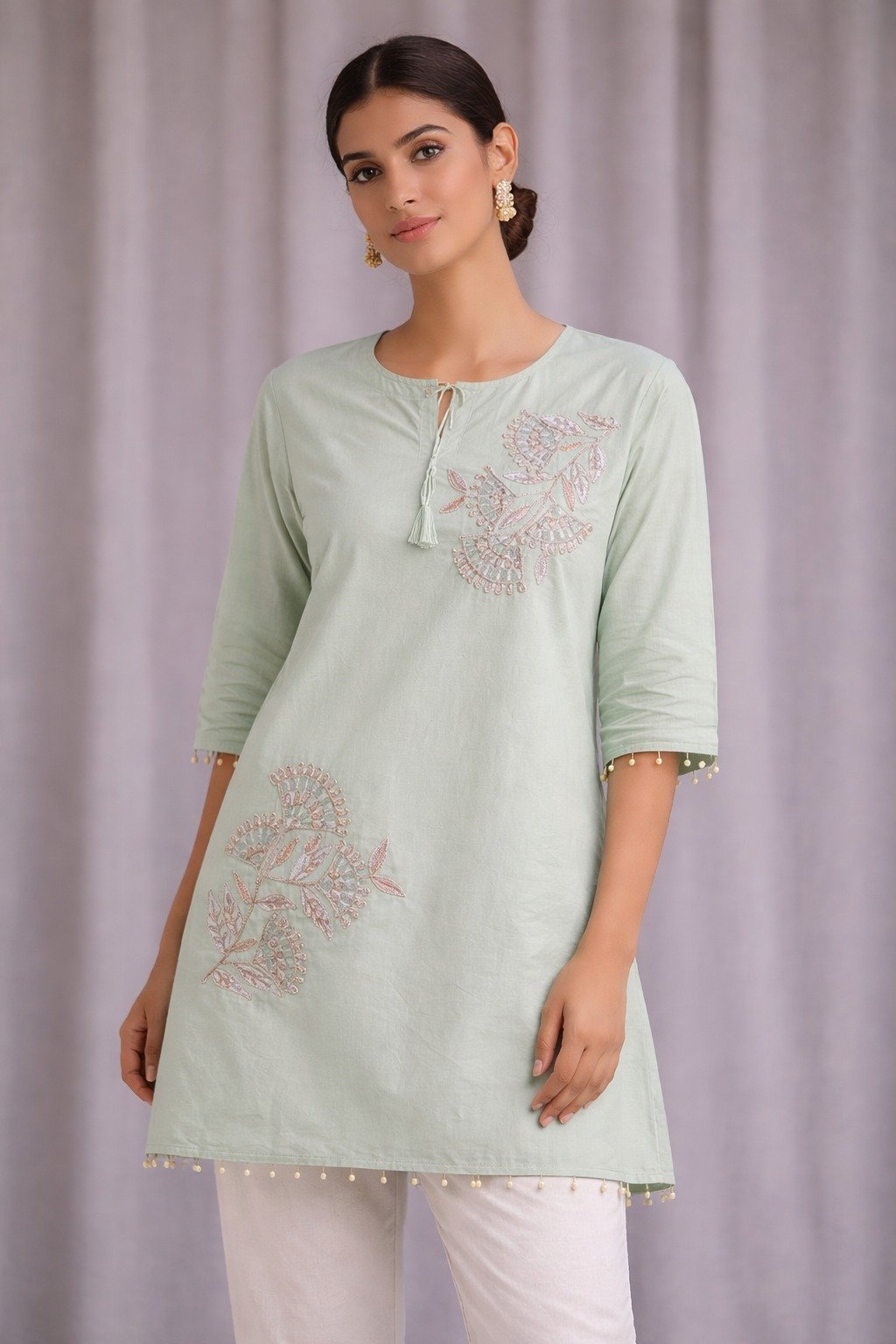 Designed with a round neckline and a small slit detail with tassel ties, the kurta blends simplicity with modern ethnic styling. The three-quarter sleeves are adorned with dainty embellishments along the edges, while the hemline is finished with delicate bead accents, enhancing its graceful appeal.