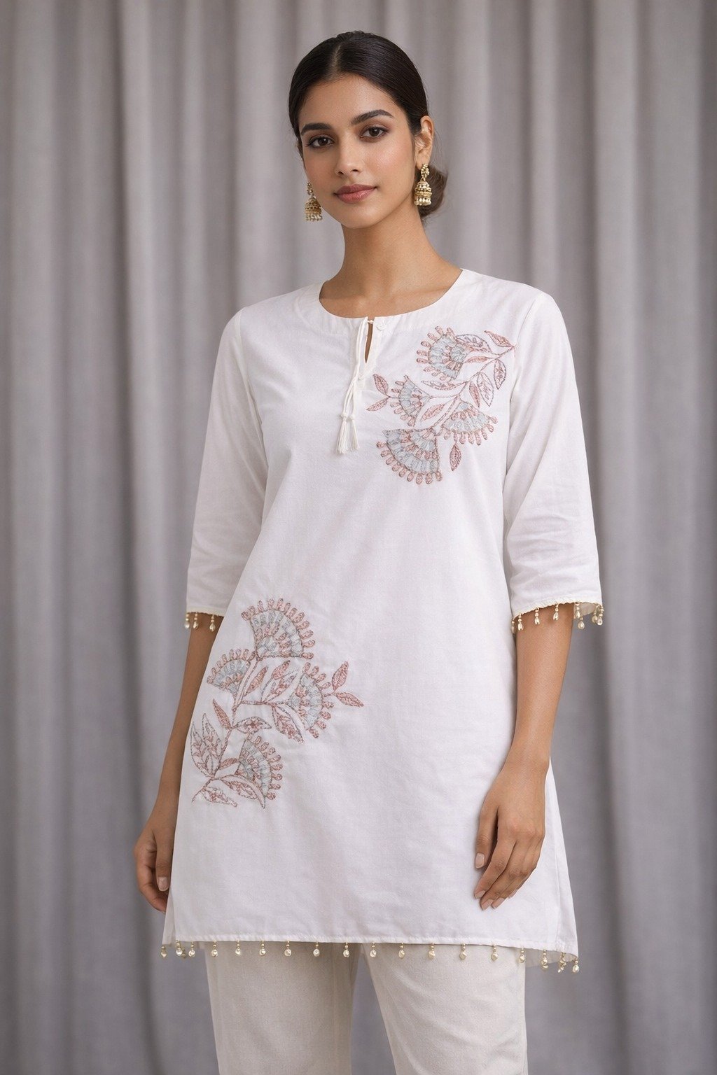 Paired with matching white straight pants, the outfit creates a clean, monochromatic look that is both sophisticated and versatile. Styled with traditional jhumka earrings and a sleek low bun, the overall aesthetic is effortlessly elegant.