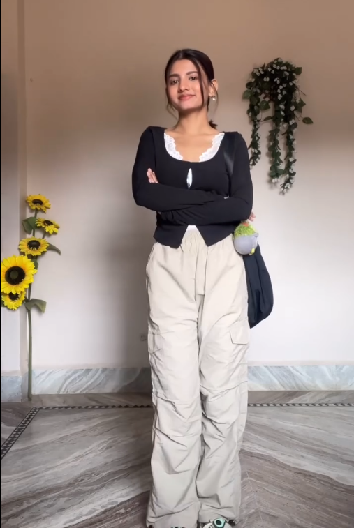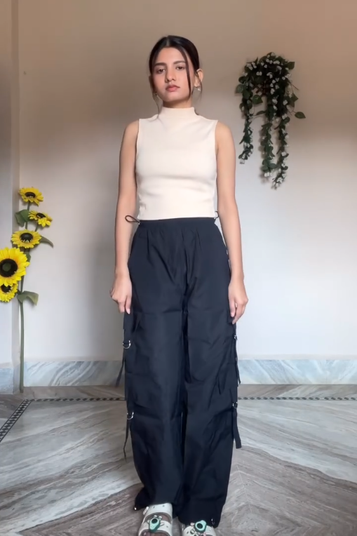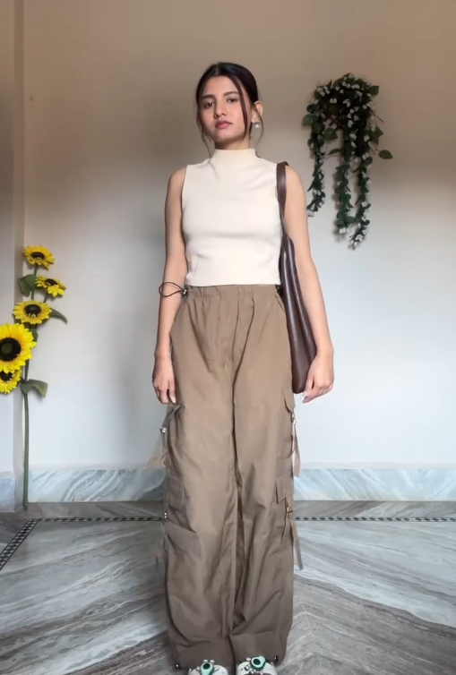 A woman stands in a soft, cozy indoor setting wearing a contemporary casual outfit. She pairs a sleek sleeveless high-neck top with relaxed cargo-style trousers, blending clean minimalism with functional streetwear elements. The loose silhouette and subtle side detailing add a modern, effortless edge, while the warm interior décor with floral accents complements the outfit’s relaxed and stylish everyday appeal.