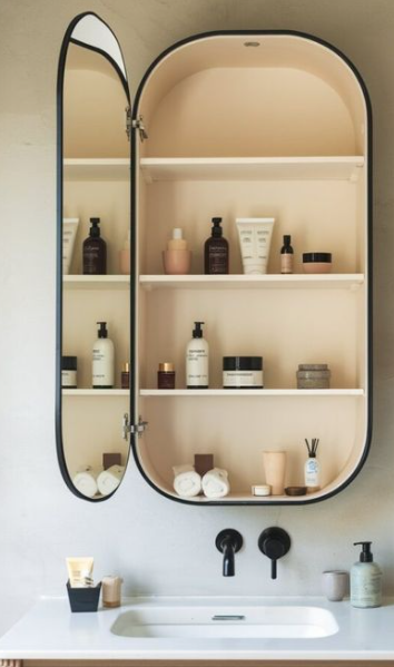 Sleek oval-shaped wall mirror with hinged doors that open to reveal three spacious beige shelves for organizing skincare, serums, creams, bottles, and bathroom essentials. Framed in matte black with a minimalist modern design, it combines functional storage with a full-length mirror reflection. Perfect for compact bathrooms, vanities, or powder rooms to keep countertops clutter-free while adding elegant style.