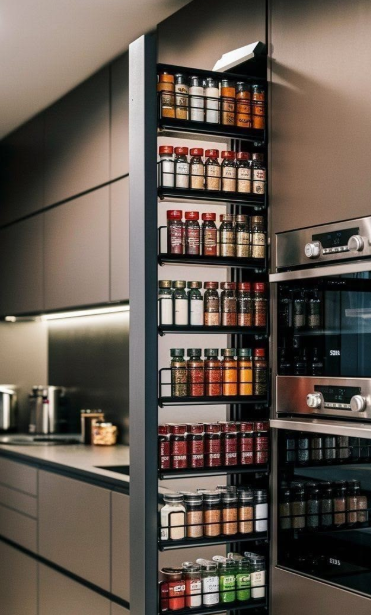 A modern pull-out pantry cabinet designed to maximize vertical kitchen space while keeping spices and dry goods perfectly organized. Featuring multiple slim shelves, it slides out smoothly for full visibility and easy access. The minimalist design blends seamlessly with contemporary cabinetry, making it an ideal solution for small kitchens or anyone who loves a clean, clutter-free cooking space.