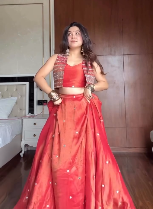 Make a vibrant style statement with this stunning red lehenga set featuring a sleeveless blouse and a matching printed jacket. The lehenga skirt is crafted in a rich, flowy fabric with delicate mirror and Bandhani-inspired detailing, creating a festive and elegant look. The embroidered jacket adds a contemporary fusion touch, making this outfit perfect for weddings, sangeet, festive celebrations, and party wear. Lightweight, graceful, and stylish, this designer lehenga set is ideal for bridesmaids and wedding guests who want a modern ethnic look with traditional charm.