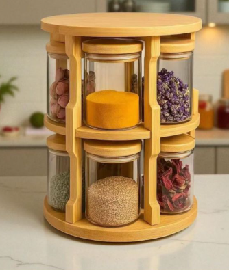 Stylish multi-tier rotating spice rack made from natural bamboo, featuring a round lazy Susan base for smooth 360° spinning. It holds six clear glass jars with bamboo lids, neatly arranged in a vertical carousel design with open compartments for easy access and visibility. Ideal for storing spices, herbs, dried flowers, grains, or small pantry items like nuts and seeds. Compact, space-saving, and adds a warm natural touch to kitchen countertops.