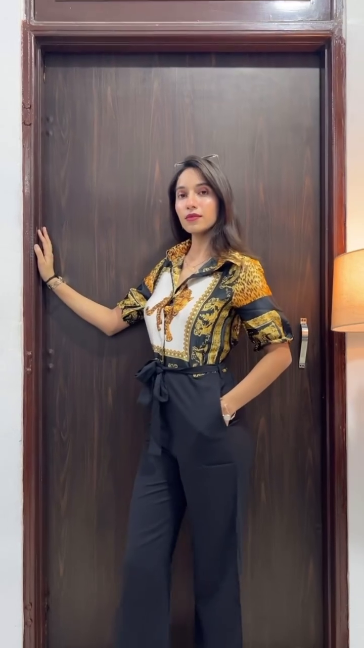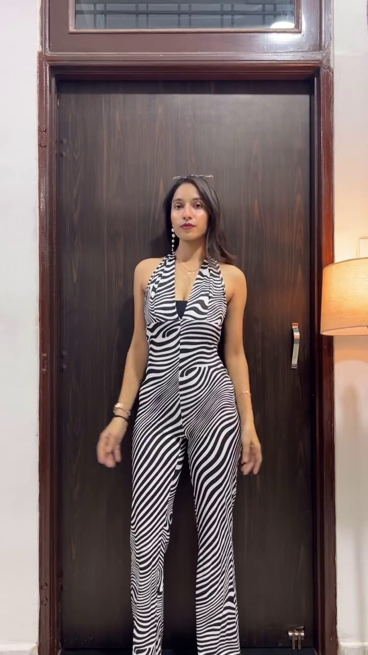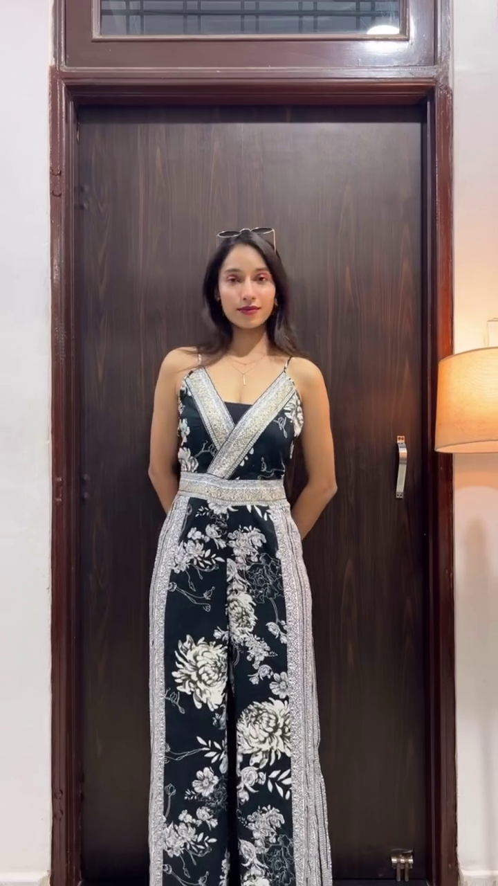 A woman poses confidently in a tailored black sleeveless jumpsuit featuring a button-down front and structured seams that enhance the silhouette. The fitted design creates a sharp, streamlined look, blending elegance with modern edge. Styled with statement earrings and subtle accessories, the outfit stands out against the warm wooden backdrop and soft ambient lighting, capturing effortless sophistication.