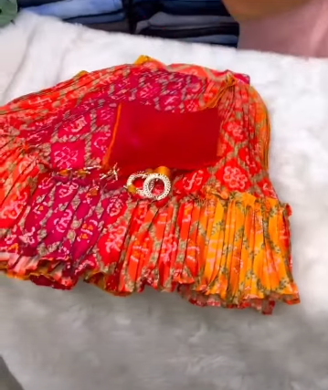This elegant frock for girls features a vibrant mix of red, pink, and orange traditional prints, creating a festive and cultural look. The outfit includes a stylish golden buckle belt that adds a touch of charm and enhances the fit. With its soft, flowy fabric and pleated hem, this dress is perfect for festivals, family gatherings, and special occasions—offering both comfort and a beautiful ethnic vibe.