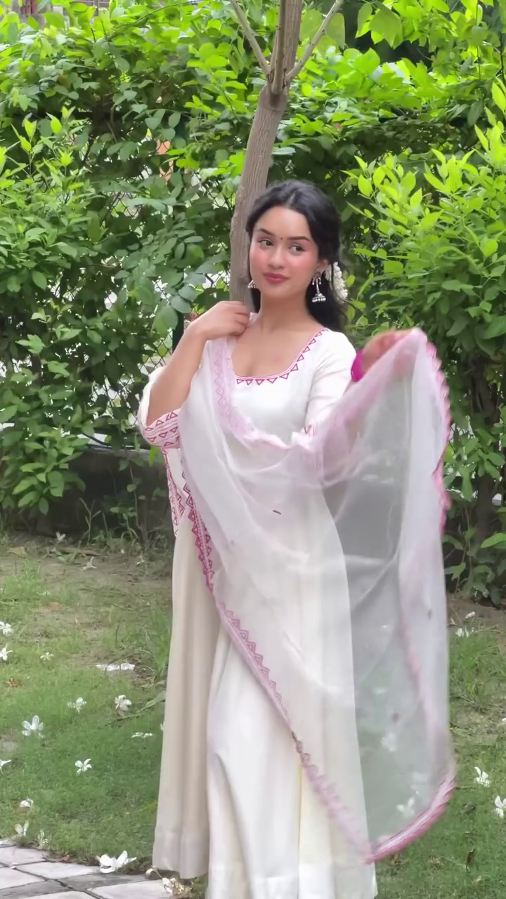 Discover this white Anarkali suit with pink embroidered border and lightweight dupatta. A graceful ethnic look perfect for festive wear, daytime functions, and traditional celebrations.