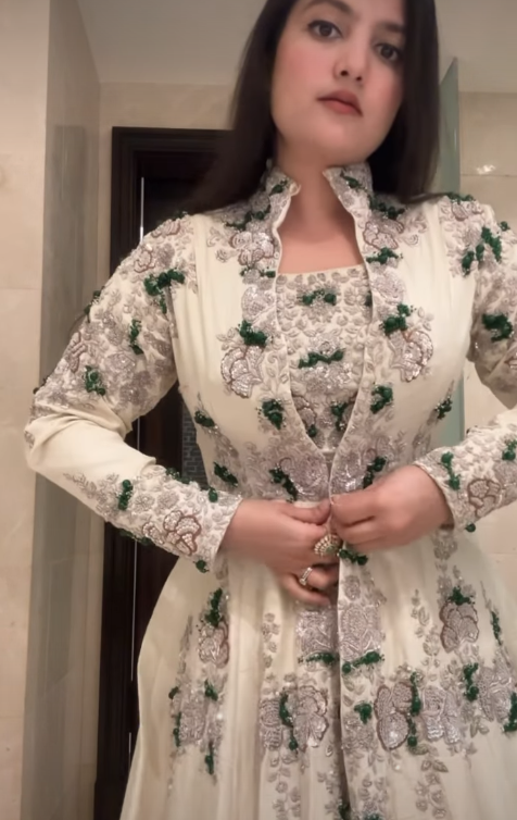The person is wearing a beautiful cream-colored Anarkali outfit adorned with intricate grey floral embroidery. The dress features full sleeves, a fitted bodice, and a gracefully flared skirt that adds movement and sophistication. Paired with soft makeup and loose, side-swept hair, the overall look is refined, graceful, and perfect for festive or formal occasions.