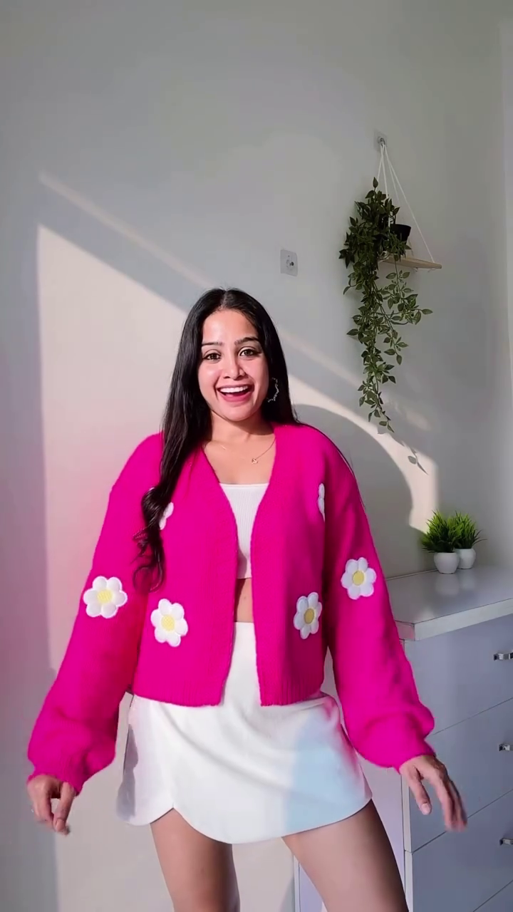 Soft pastel petals or contrasting blooms adorn the ribbed base, creating a harmonious interplay between texture and pattern. Whether embroidered with thread or attached as fabric petals, these flowers bring dimension and femininity to the cardigan without overwhelming its simplicity.