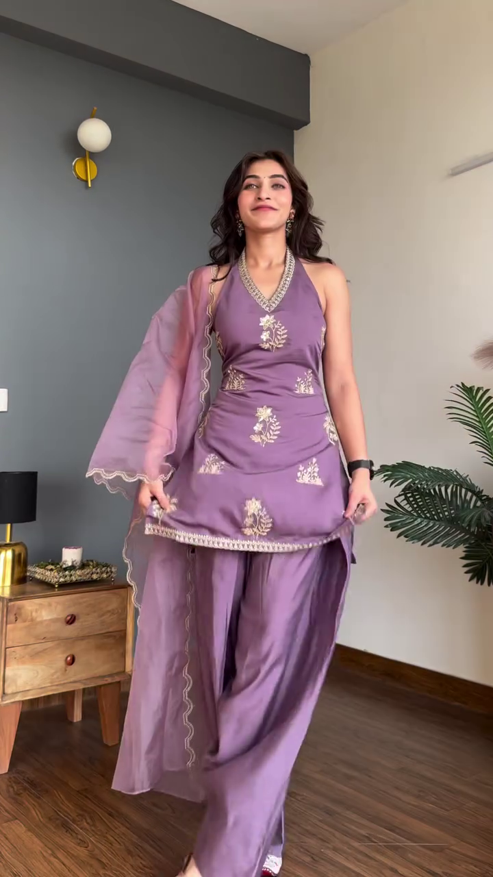 Perfect for women who want a stylish alternative to heavier lehengas or sarees, this lavender kurta and palazzo set delivers festive impact with lightweight comfort. Style it with statement earrings and heels for a complete occasion-ready outfit. Elegant, breathable, and fashion-forward, this embroidered kurta set is a standout choice for modern ethnic wear and celebration dressing.