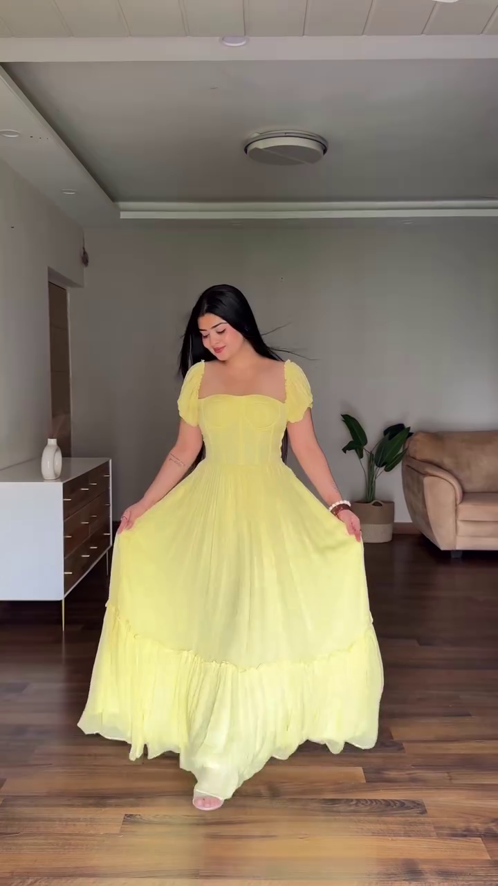 Brighten your wardrobe with this stunning yellow maxi dress featuring a flattering corset-style bodice and soft puff sleeves. Crafted in lightweight, flowy fabric, this dress offers a graceful silhouette with a tiered flared skirt for effortless movement. The square neckline and fitted waist enhance your shape, making it perfect for summer outings, brunch dates, vacations, parties, and special occasions. Comfortable, feminine, and stylish, this long gown is ideal for women who love elegant yet easy-to-wear fashion. Pair it with heels or sandals for a chic, breezy look.
